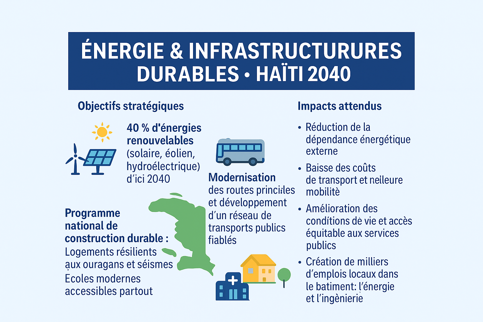 ° Construire une Hayti sûre, résiliente, prospère et inclusive, avec une économie verte, une gouvernance transparente et un développement respectueux de l’environnement et des générations futures.